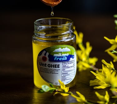 este obținut din 100% unt de 82%gr, din lapte de vaca, supranumit aurul bucătăriei ayurvedice. Potrivit pentru gătit, prajit( punctul de ardere este la 250 grade C), copt, sau asezonat.